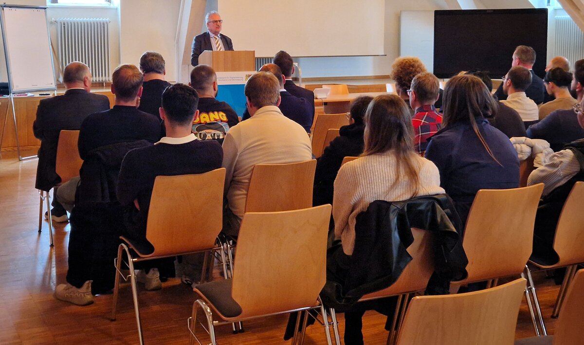Der erste Unterrichtstag (11. September 2025) begann mit der Großveranstaltung in der Mehrzweckhalle in Ansbach. Herr Vizepräsident Andreas Koch legte als Leiter der IuK-Abteilung in seiner Rede einen Schwerpunkt auf die Notwendigkeit einer funktionierenden IT, damit an den Finanzämtern schnell und effektiv gearbeitet werden kann. Mit den SINA-EDA-Laptops wird hierzu ein wichtiger Beitrag geleistet. Alle, die sich in Ausbildung befinden, werden vorrangig mit den Geräten ausgestattet.