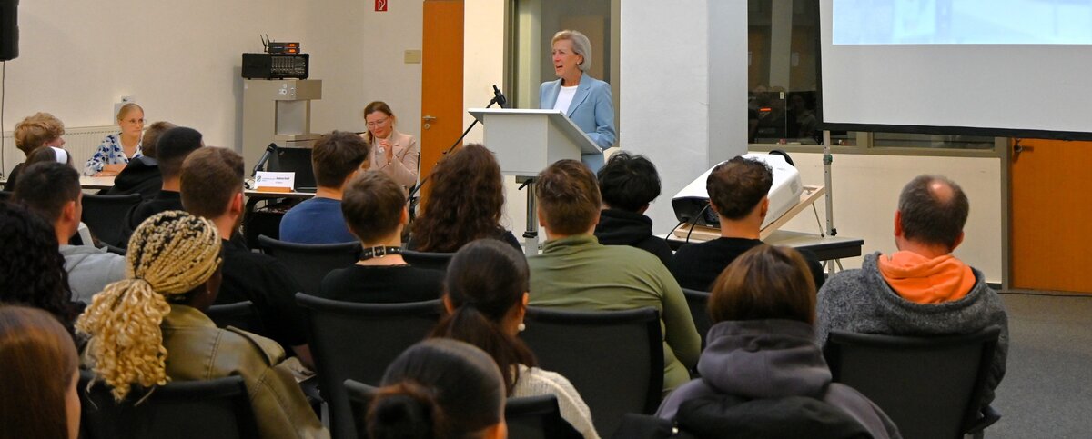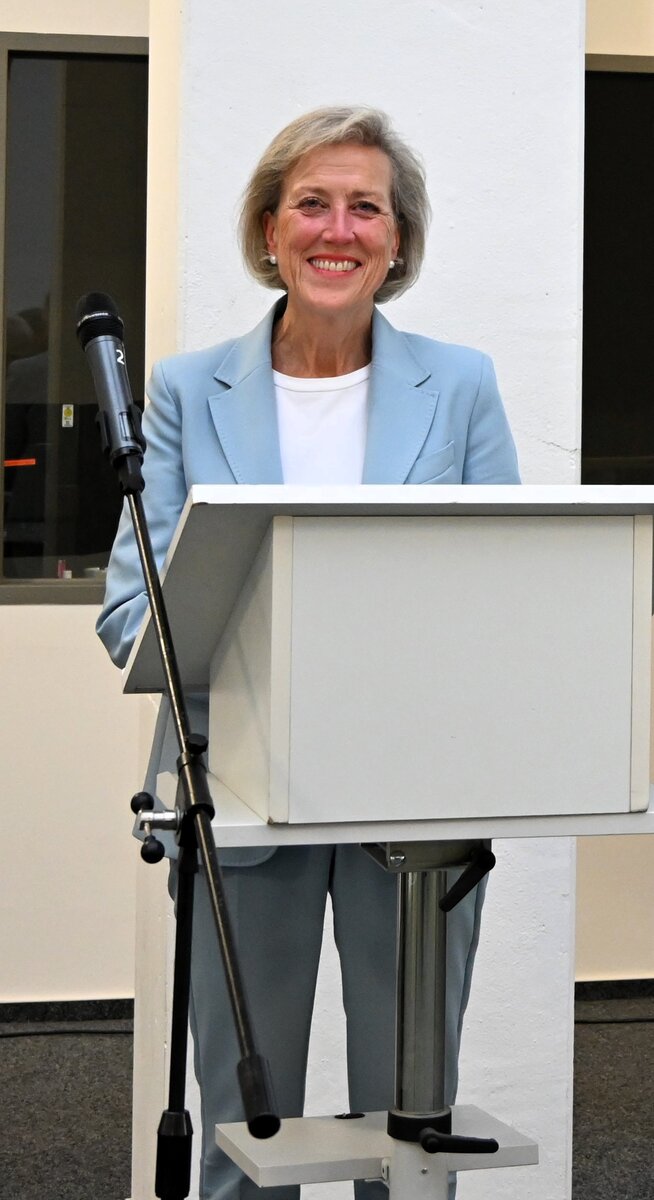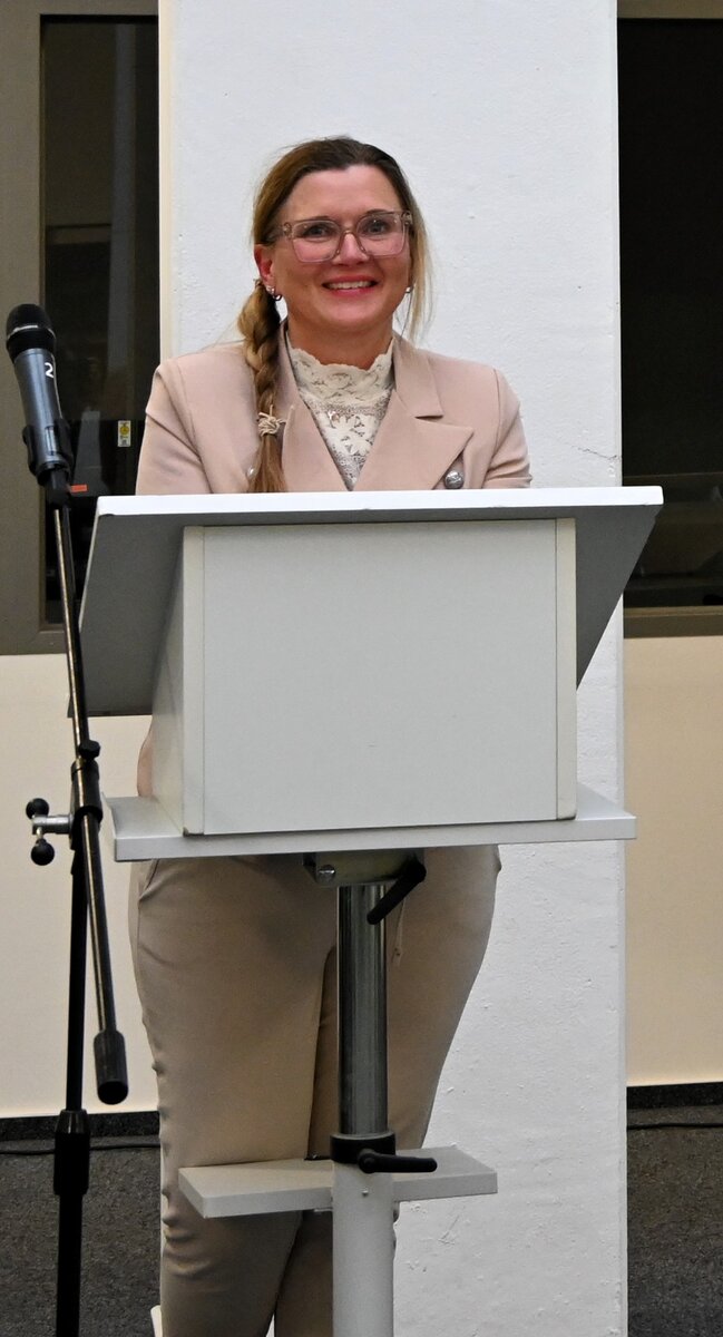Am 10. September 2025 wurden in Dinkelsbühl die Anwärter/-innen der Fachrichtung Steuer in der Aula des dortigen Schulungszentrums begrüßt. Das Bayerische Landesamt für Steuern wurde von Frau Abteilungsleiterin Antje Weichert-Puff (Foto links) repräsentiert. Sie forderte die Auszubildenden auf, stolz auf den ergriffenen Beruf zu sein. Es lohne sich, Teil einer Verwaltung mit einem sehr guten Ruf zu sein, die gleichzeitig eine tragende Säule des Staates darstelle. Weiterhin zeigte sie die Entwicklungsmöglichkeiten in der späteren Laufbahn auf.